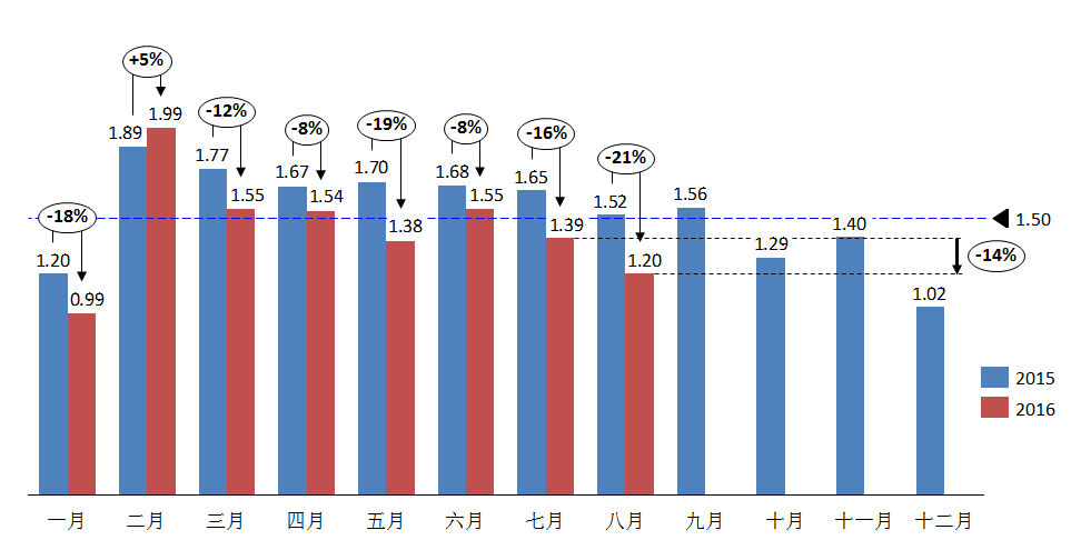 2016年8月份經(jīng)銷商庫(kù)存系數(shù)為1.20