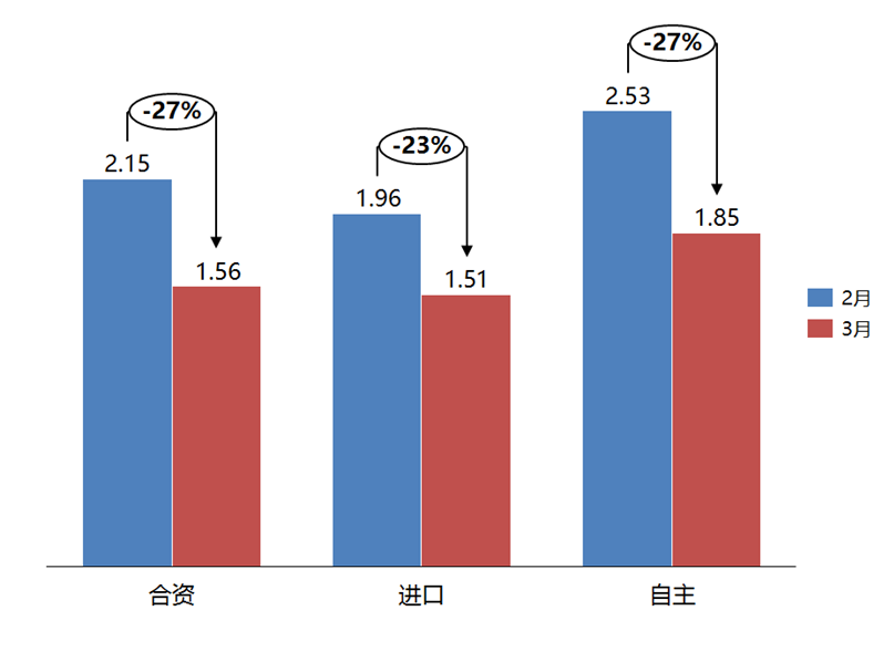 3月份,合資品牌、進(jìn)口品牌和自主品牌的庫(kù)存系數(shù)相比上月均有所下降。合資品牌庫(kù)存系數(shù)為1.56,環(huán)比下降27%;進(jìn)口品牌庫(kù)存系數(shù)為1.51,環(huán)比下降23%;自主品牌庫(kù)存系數(shù)為1.85,環(huán)比下降27%。3月,合資品牌、進(jìn)口品牌和自主品牌庫(kù)存水平均位于警戒線以上。