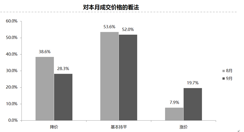 調(diào)查結(jié)果顯示,認(rèn)為成交價格下降的經(jīng)銷商比例為28.3%;認(rèn)為漲價的比例為19.7%;認(rèn)為成交價格與上月基本持平的比例為52.0%.