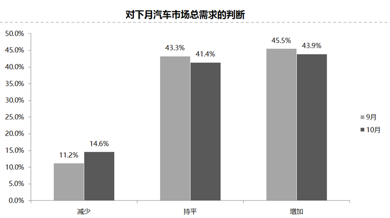 預(yù)計10月份市場需求比9月增加,認(rèn)為市場需求“增加”的經(jīng)銷商比例為43.9%;認(rèn)為市場需求“減少”的比例為14.6%;認(rèn)為市場需求“持平”的比例為41.4%。