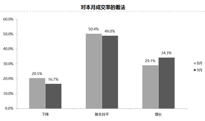 調(diào)查結(jié)果顯示,認(rèn)為成交率增長的比例為34.3%;認(rèn)為下降的比例為16.7%;認(rèn)為基本持平的比例為49.0%。
