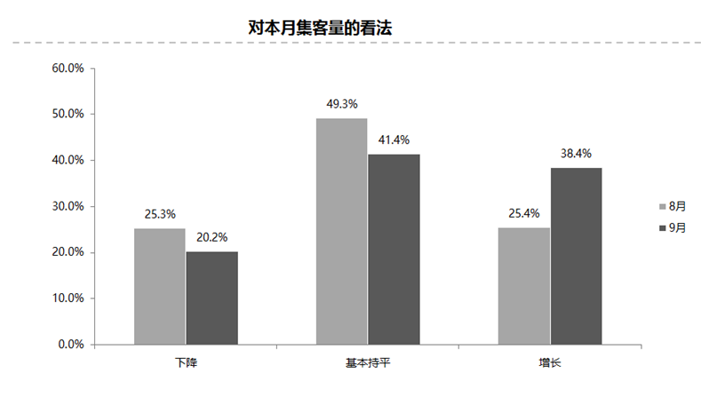 調(diào)查結(jié)果顯示, 9月份集客量比上月上升,認(rèn)為9月份集客量下降的經(jīng)銷商比例為20.2%;認(rèn)為增長的比例為38.4%;認(rèn)為集客量基本持平的比例為41.4%。