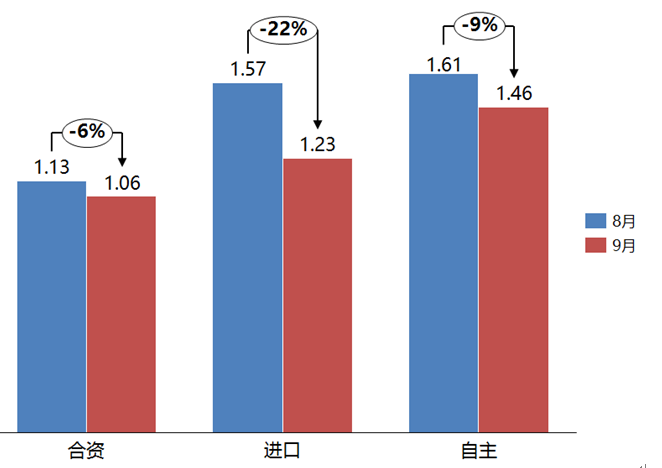 9月份,合資品牌、自主品牌、進口品牌庫存系數(shù)相比上月下降。合資品牌庫存系數(shù)為1.06,環(huán)比下降6%;自主品牌庫存系數(shù)為1.46,環(huán)比下降9%;進口品牌庫存系數(shù)為1.23,環(huán)比下降22%。9月,經(jīng)銷商的庫存壓力相比8月有所緩解。