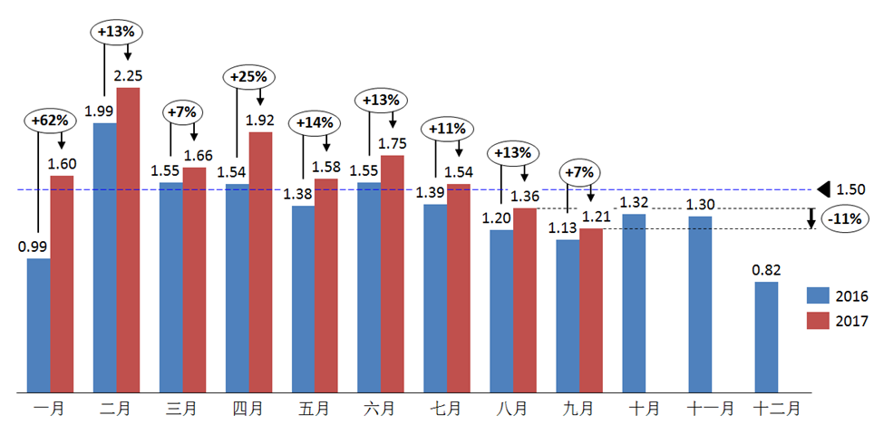 2017年9月汽車經(jīng)銷商庫存系數(shù)為1.21