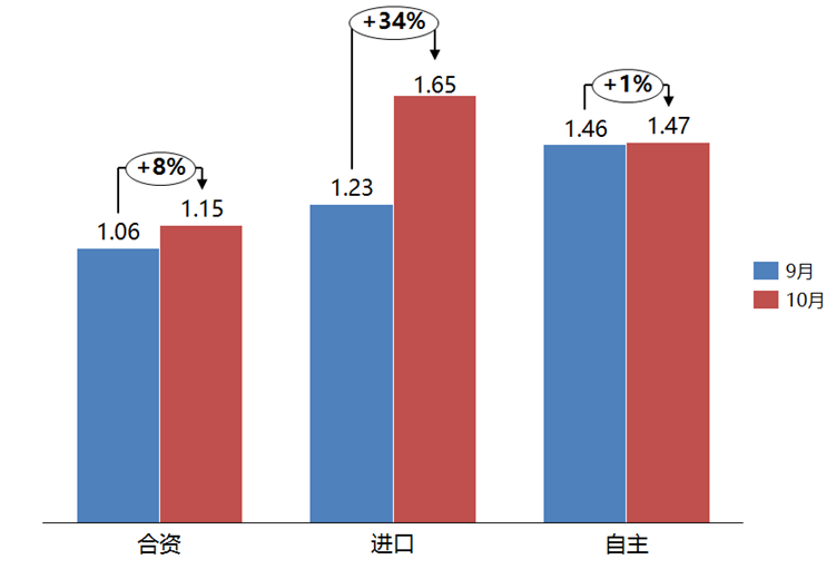 10月份,合資品牌、自主品牌、進口品牌庫存系數(shù)相比上月均上升。合資品牌庫存系數(shù)為1.15,環(huán)比上升8%;自主品牌庫存系數(shù)為1.47,環(huán)比上升1%;進口品牌庫存系數(shù)為1.65,環(huán)比上升34%。10月,經(jīng)銷商的庫存壓力相比9月有所增加。