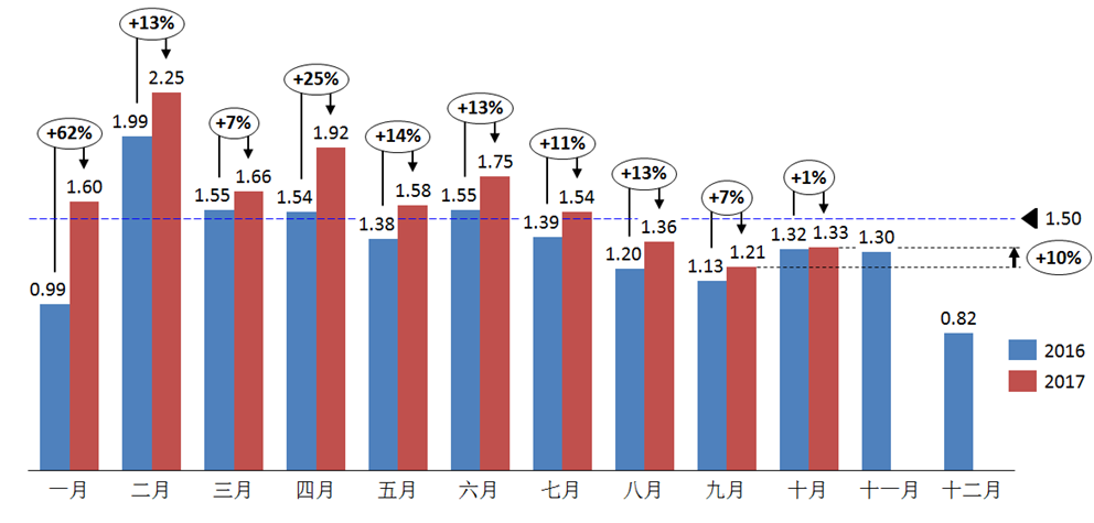 2017年10月汽車經(jīng)銷商庫存系數(shù)為1.33