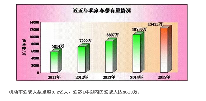 2015年,小型載客汽車達(dá)1.36億輛,其中,以個人名義登記的小型載客汽車(私家車)達(dá)到1.24億輛,占小型載客汽車的91.53%。與2014年相比,私家車增加1877萬輛,增長17.77%。全國平均每百戶家庭擁有31輛私家車,北京、成都、深圳等大城市每百戶家庭擁有私家車超過60輛。