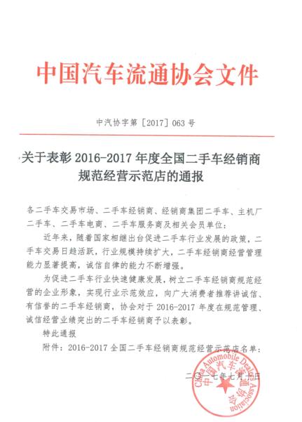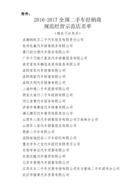 關(guān)于表彰2016-2017年度全國二手車經(jīng)銷商規(guī)范經(jīng)營示范店的通報