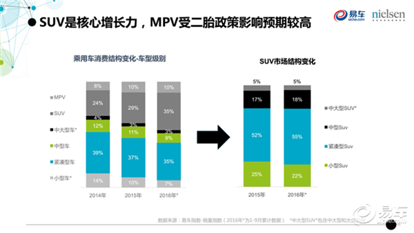 2016年用戶對(duì)SUV消費(fèi)熱情依然不減,SUV市場份額已逐漸接近緊湊型轎車并有超越其趨勢,其中緊湊型SUV市場份額提升明顯,也是SUV整體銷量增長的核心推動(dòng)力。受二胎政策影響,七座車型MPV受到青睞,甚至中型SUV尤其是七座產(chǎn)品更是備受關(guān)注。