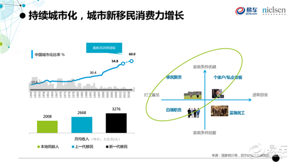 隨著我國城市化進(jìn)程加速推進(jìn),新一代城市移民與上一代移民和本地同齡人相比收入水平和購買力均有所提升,包括移民新貴在內(nèi)的收入中上群體成為重要的購車新勢力。