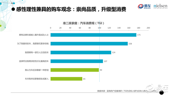 由于準(zhǔn)二孩家庭多為80,他們作為社會(huì)和家庭的中堅(jiān)力量,消費(fèi)需求旺盛、消費(fèi)實(shí)力強(qiáng)勁,且消費(fèi)信念堅(jiān)定。29%的人因?yàn)槟壳败囎硬荒軡M足需要,需要換購;24%的人因經(jīng)濟(jì)條件提升,可以增購。他們的汽車消費(fèi)態(tài)度,就是在理性中追求更高品質(zhì)、更高身份感、更適當(dāng)實(shí)用。