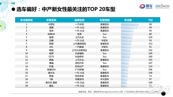 中產(chǎn)新女性最關(guān)注的TOP20車型中,緊湊型轎車占比明顯增多,中型車則剛好相反,SUV車型途觀排名也明顯提前。