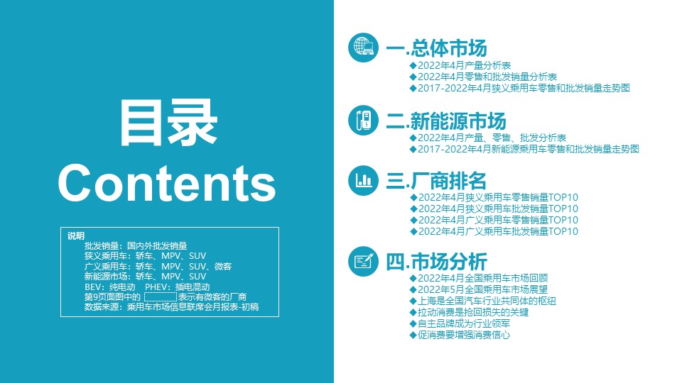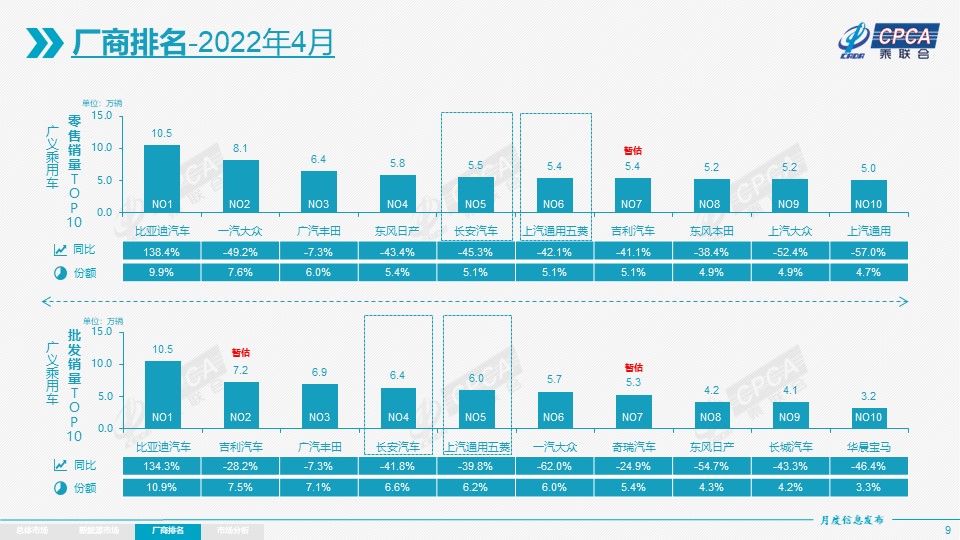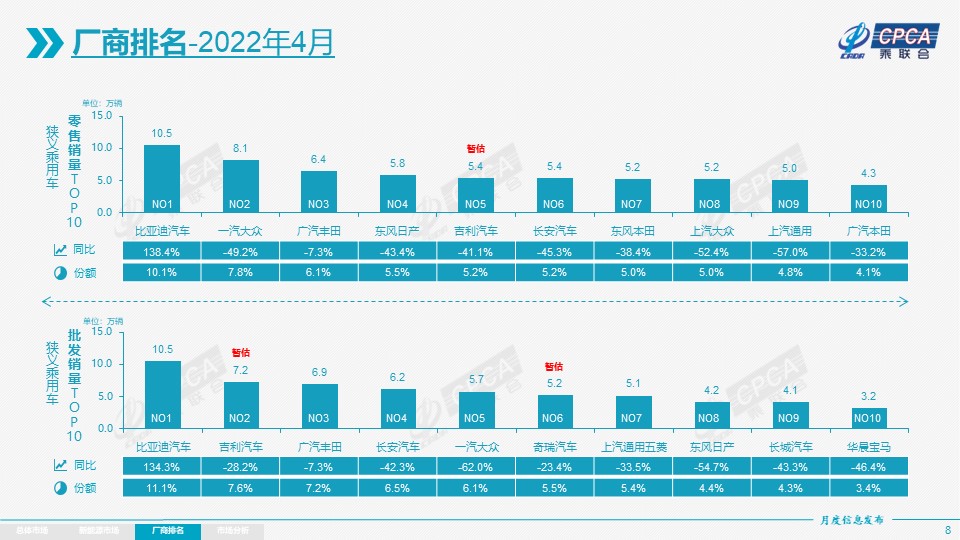 零售:2022年4月乘用車市場零售達(dá)到104.2萬輛,同比下降35.5%,環(huán)比下降34.0%,4月零售同比與環(huán)比增速均處于當(dāng)月歷史最低值。1-4月累計零售595.7萬輛,同比下降11.9%,同比減少80萬輛,其中4月同比下降57萬輛的影響較大。4月新冠疫情在全國各地都有散發(fā)擴(kuò)散,全國有29個省在4月報告有確診病例或無癥狀感染者,上海、吉林、山東、廣東、河北等地的經(jīng)銷商4S店客戶進(jìn)店和成交都受到影響。4月零售降幅較大,同比增速數(shù)值的可對比月度是2020年的3月零售同比下降40%。4月豪華車零售12萬輛,同比下降54%,環(huán)比下降50%。豪華車主銷區(qū)域受到防疫封控形勢變化的影響,產(chǎn)銷損失巨大,原本的供需緊平衡狀態(tài)再次被打破。4月自主品牌零售48萬輛,同比下降19%,環(huán)比下降37%。4月自主品牌國內(nèi)零售份額為46.4%,同比增長9.6個百分點(diǎn);1-4月累計份額46%,相對于2021年同期增長8.3個百分點(diǎn)。4月自主品牌批發(fā)市場份額57.7%,較去年同期份額增加16.2個百分點(diǎn);1-4月自主累計份額48%,相對于2021年同期增加6.7個百分點(diǎn)。自主在新能源市場獲得明顯增量,頭部企業(yè)表現(xiàn)優(yōu)異,比亞迪汽車、吉利汽車、長安汽車和奇瑞汽車等傳統(tǒng)車企品牌份額提升明顯。4月主流合資品牌零售45萬輛,同比下降42%,環(huán)比下降24%。4月的日系品牌零售份額24.5%,同比下降0.5個百分點(diǎn)。德系品牌份額19.4%,同比下降5.2個百分點(diǎn)。美系市場零售份額達(dá)到6.4%,同比下降3.1個百分點(diǎn)。神龍汽車等的法系份額提升0.4個百分點(diǎn)。出口:4月乘聯(lián)會統(tǒng)計口徑下的乘用車出口(含整車與CKD)9.1萬輛,同比下降17%,環(huán)比下降15%。生產(chǎn)減量對車企出口帶來影響。4月新能源車占出口總量的8.3%。4月自主品牌出口達(dá)到7.9萬輛,同比下降5%;合資與豪華品牌出口1.2萬輛,同比下降60%。生產(chǎn):4月乘用車生產(chǎn)96.9萬輛,同比下降41.1%,環(huán)比下降46.8%,壓力巨大。其中豪華品牌生產(chǎn)同比下降57%,環(huán)比下降43%;合資品牌生產(chǎn)同比下降56%,環(huán)比下降58%;自主品牌生產(chǎn)同比下降20%,環(huán)比下降38%。受疫情影響進(jìn)口零部件短缺,涉及長三角地區(qū)的國產(chǎn)零部件體系供應(yīng)商無法及時供貨,有的甚至完全停工、停運(yùn),加之物流效率降低和運(yùn)輸時長不可控,導(dǎo)致生產(chǎn)不暢問題突出。4月上海地區(qū)五家主力車企生產(chǎn)環(huán)比3月下降75%,長春地區(qū)合資主力車企生產(chǎn)下降54%,其他地區(qū)總體下降38%,上海地區(qū)零部件體系的全國輻射效應(yīng)凸顯。批發(fā):4月廠商批發(fā)銷量94.6萬輛,同比下降43.0%,環(huán)比下降47.8%,受生產(chǎn)的制約,部分車企表現(xiàn)分化明顯。1-4月的廠商批發(fā)銷量達(dá)到638.6萬輛,同比增速從1-3月增長8.3%變?yōu)橄陆?.5%,一季度開門紅被毀。4月的產(chǎn)銷損失大,形成廠商產(chǎn)量高于銷量2萬輛、廠商國內(nèi)批發(fā)低于零售19萬輛的推動式產(chǎn)銷走勢,也形成了4月廠商零售環(huán)比3月增速(-34.0%)大幅好于批發(fā)增速(-47.8%)的特征。庫存:2021年四季度廠商庫存迅速回補(bǔ),奠定了今年1-4月批發(fā)的強(qiáng)勢表現(xiàn)。季度末因素導(dǎo)致4月增庫存的特征,分解來看,4月份廠商庫存環(huán)比增長2萬輛,1-4月累計下降6萬輛,而2021年1-4月廠商庫存下降20萬輛,今年的廠商庫存改善較大。4月渠道庫存環(huán)比下降19萬輛,1-4月渠道庫存下降8萬輛,較2021年1-4月下降44萬輛形成強(qiáng)烈對比,拉動今年1-4月批發(fā)增速下降4.5%大幅高于零售增速下降11.9%的批發(fā)數(shù)據(jù)亮點(diǎn)。目前經(jīng)銷商庫存處于中高位,但由于疫情下的生產(chǎn)不足,在途庫存占比上升,部分熱銷車型生產(chǎn)短缺,導(dǎo)致供需結(jié)構(gòu)不匹配且調(diào)整難度大;缺少旺銷車型的零售增量,也使庫存系數(shù)有虛高問題。不少經(jīng)銷商的庫存中包含“在途車輛”,交不了車就回不了款,不僅不能滿足客戶新增定單需求,而且容易導(dǎo)致客戶退車。目前的庫存狀態(tài),加劇經(jīng)銷商端的資金困難,紓困難題較為突出。新能源: 4月新能源乘用車批發(fā)銷量達(dá)到28.0萬輛,同比增長50.1%,環(huán)比下降38.5%,環(huán)比下降幅度異常,新能源發(fā)展同樣受到當(dāng)前疫情波及和沖擊。1-4月新能源乘用車批發(fā)146.9萬輛,同比增長119.0%。4月新能源乘用車零售銷量達(dá)到28.2萬輛,同比增長78.4%,環(huán)比下降36.5%,異于歷年4月走勢。1-4月新能源乘用車國內(nèi)零售135.2萬輛,同比增長128.4%。新能源車市場方面,尚未受到漲價的影響,漲價前訂單表現(xiàn)火爆,訂單充足。4月的新能源車與傳統(tǒng)燃油車環(huán)比走勢都受到生產(chǎn)影響,新能源車供不應(yīng)求加劇導(dǎo)致未交付訂單拖期嚴(yán)重。疫情下私車出行拉動的新能源車強(qiáng)勢增長,家庭第二輛車的安全出行意義重大,呼應(yīng)了城鎮(zhèn)居民在短途出行中對新能源車型的進(jìn)一步認(rèn)可和適應(yīng)。1) 批發(fā):4月新能源車廠商批發(fā)滲透率29.6%,較2021年4月11.2%的滲透率提升18個百分點(diǎn)。4月,自主品牌新能源車滲透率48.8%;豪華車中的新能源車滲透率4.8%;而主流合資品牌新能源車滲透率僅有3.7%。4月純電動批發(fā)銷量21.4萬輛,同比增